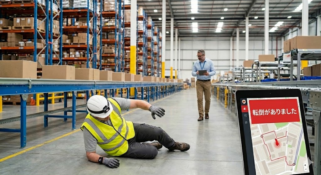 作業現場での転倒をセンサーが自動検知し、管理者へ通知。